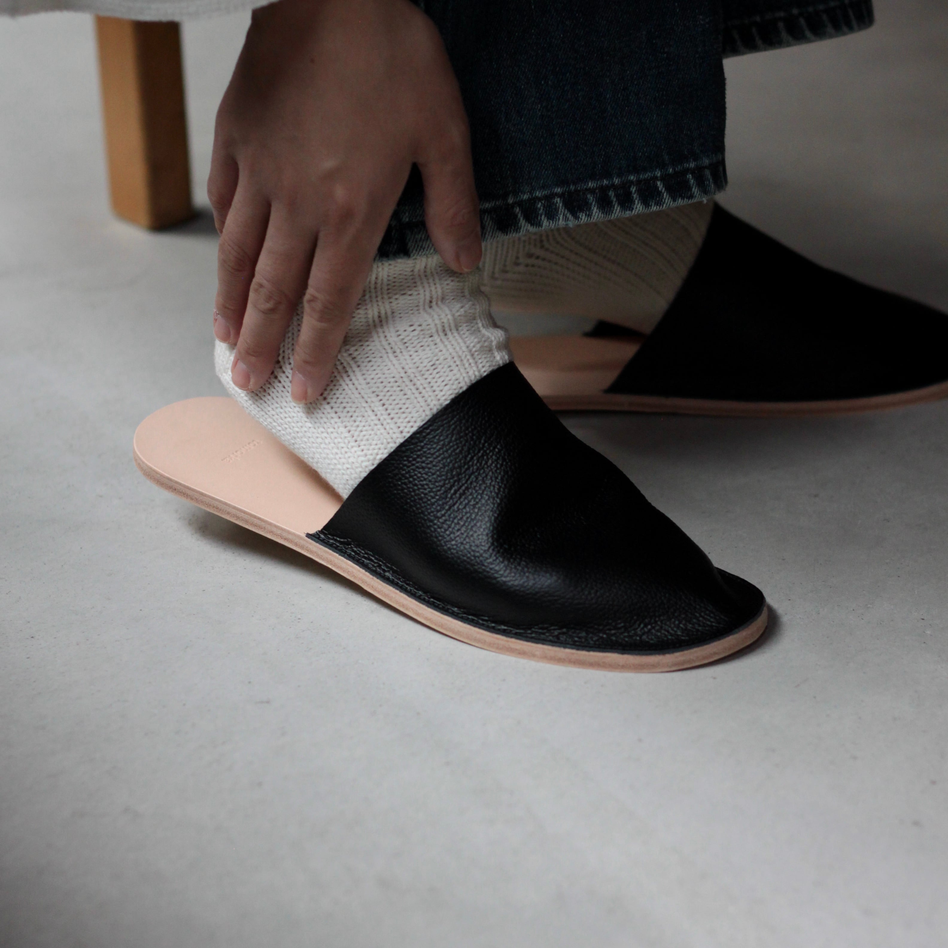 左右対称の形ですが、革が足なりに馴染んでいく事で右足左足が生まれ、オリジナルフィッティングのスリッパに仕上がります。