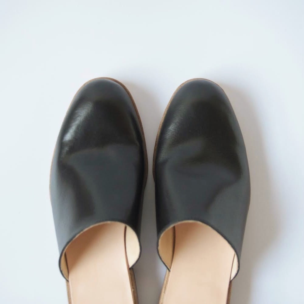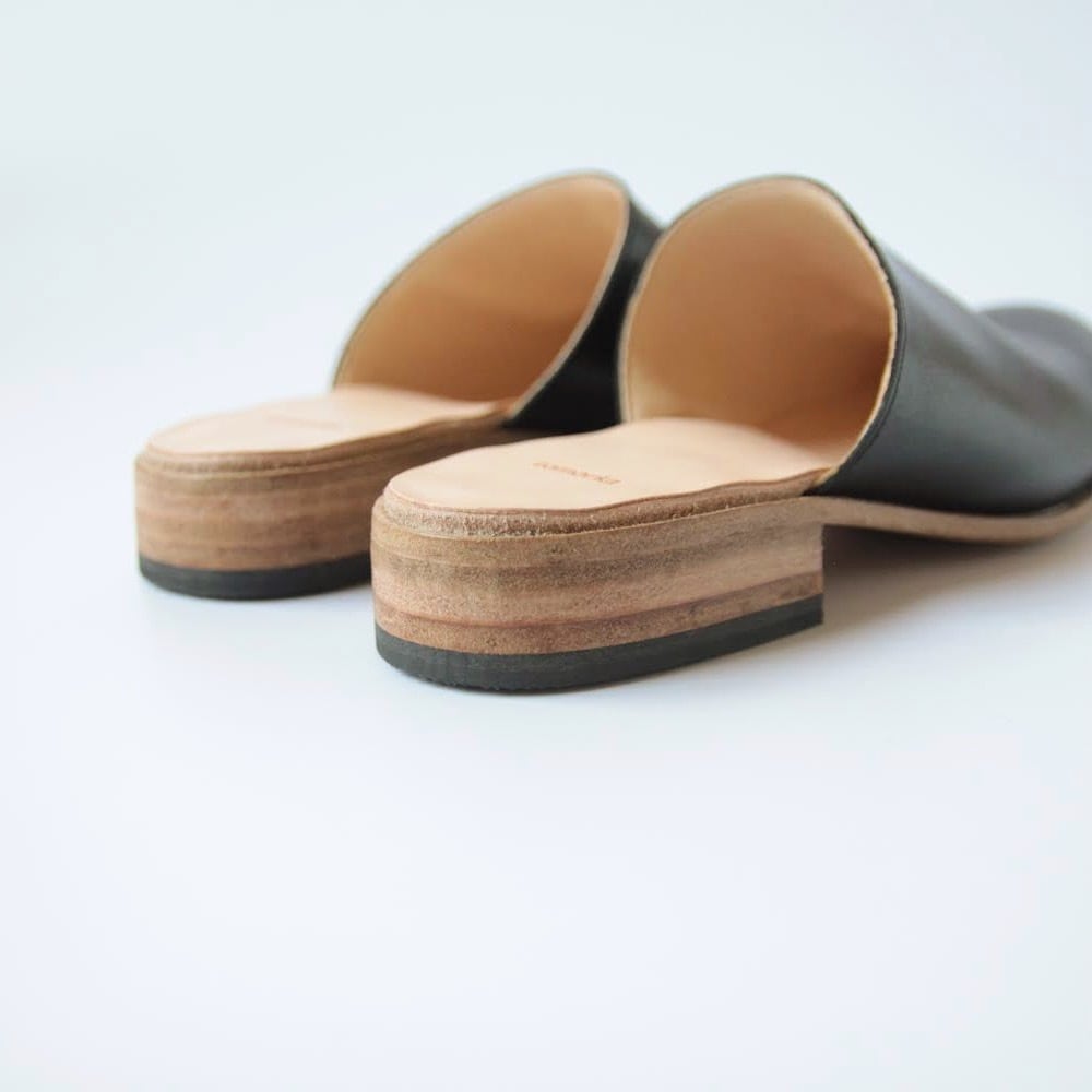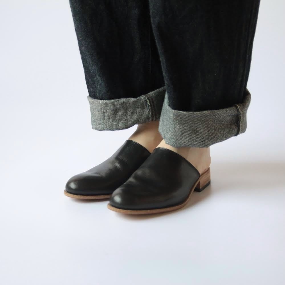 デザイナー自身が工房とお店を行き来する際に、脱ぎ履きしやすく、作業中や店内でもきちんと履けるものが欲しいと思ったのをきっかけにデザインしたシューズです。