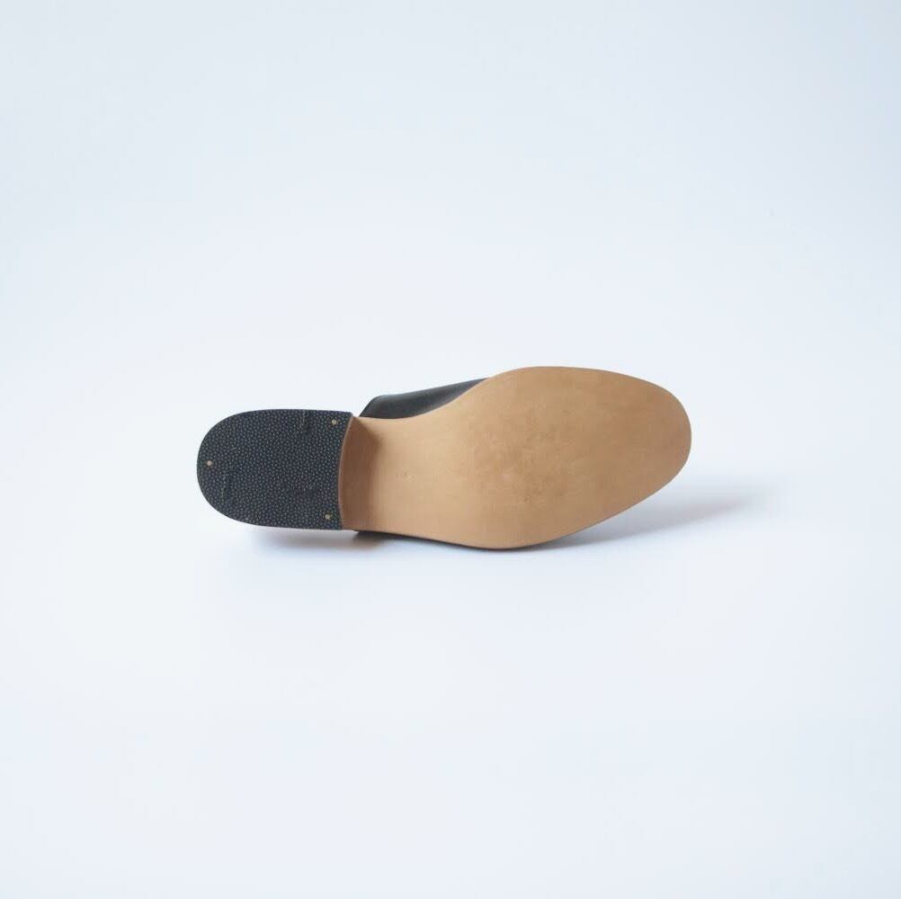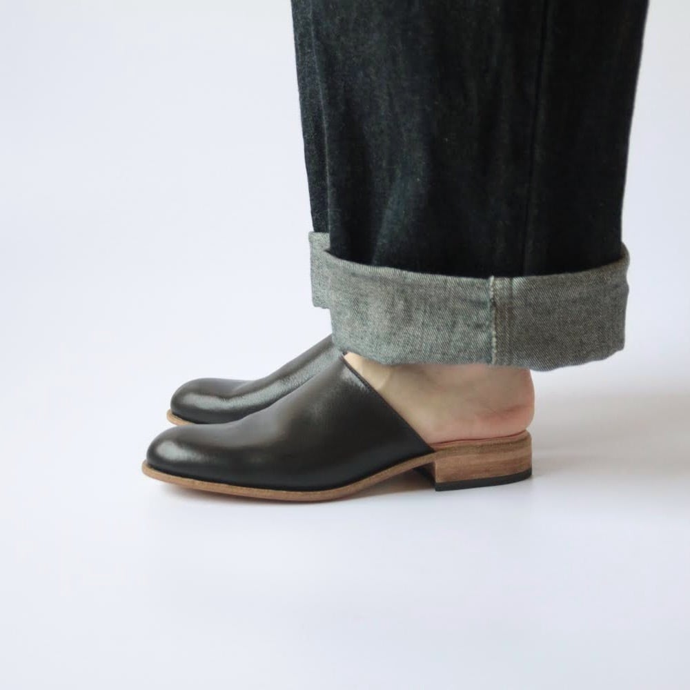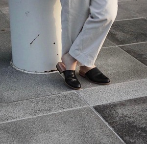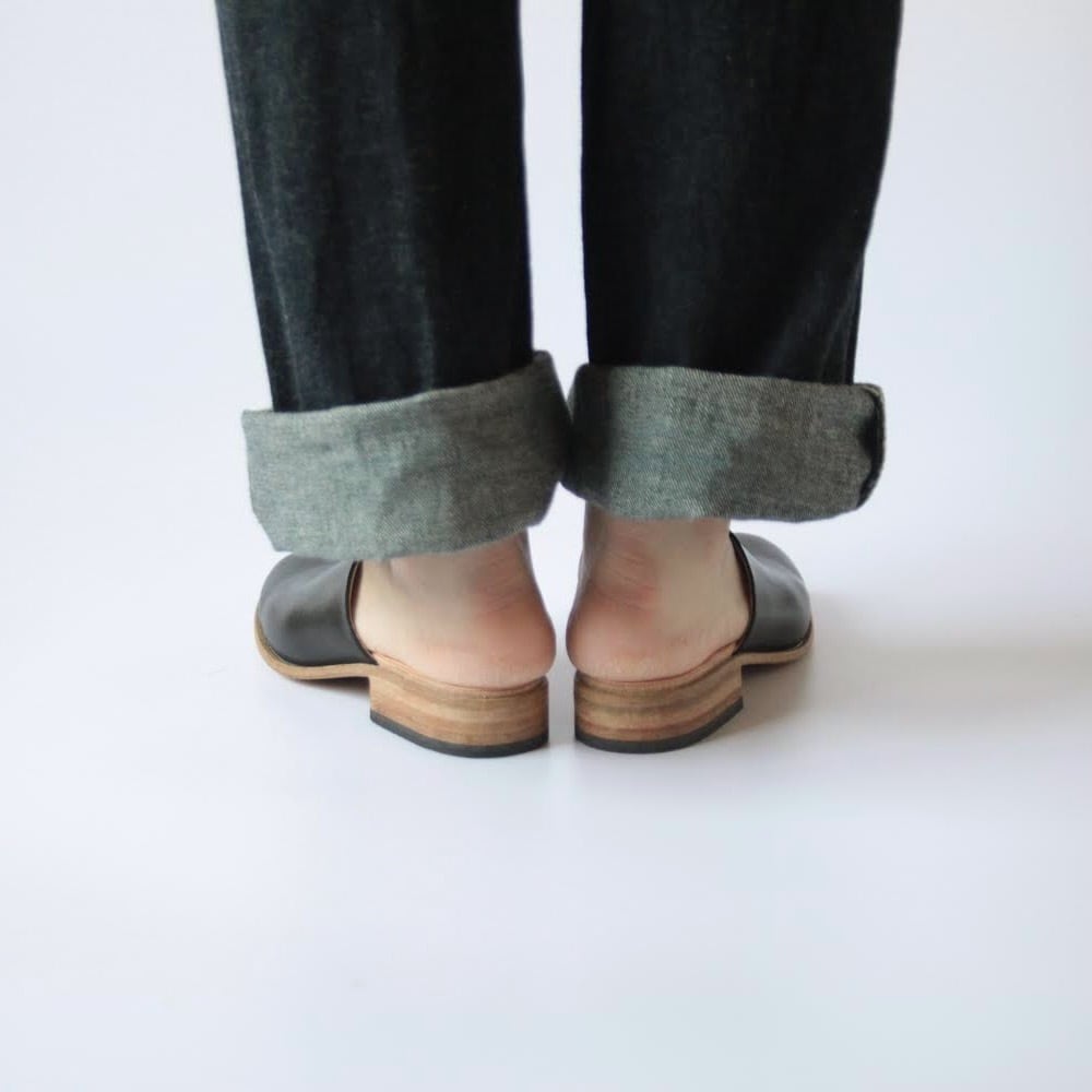 デザイナー自身が工房とお店を行き来する際に、脱ぎ履きしやすく、作業中や店内でもきちんと履けるものが欲しいと思ったのをきっかけにデザインしたシューズです。